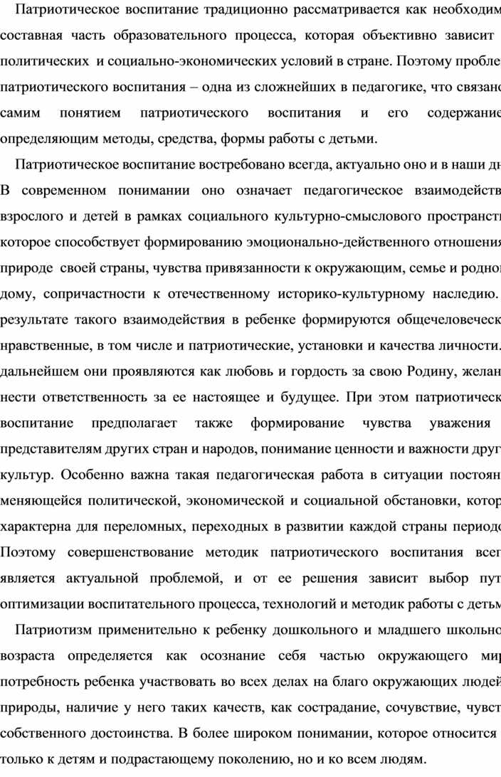 Патриотическое воспитание традиционно рассматривается как необходимая составная часть образовательного процесса, которая объективно зависит от политических и социально-экономических условий в стране. Поэтому проблема патриотического воспитания – одна из сложнейших в педагогике, что связано с самим понятием патриотического воспитания и его содержанием, определяющим методы, средства, формы работы с детьми.
