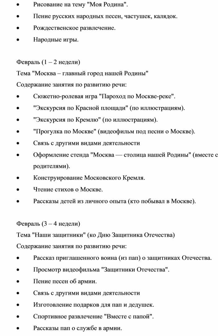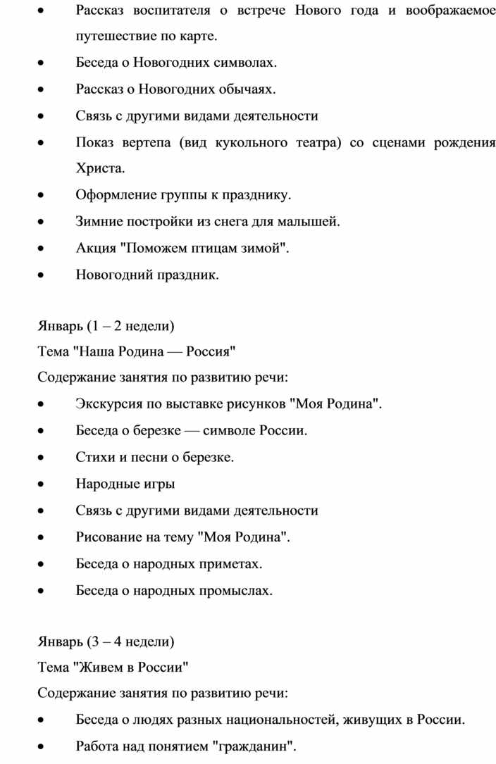 Тематическое планирование способствует эффективному и системному усвоению детьми знаний о своей стране, родном крае, той местности, где они живут. Причем темы повторяются в каждой группе. Изменяются только содержание, объем познавательного материала и сложность, следовательно, и длительность изучения. Отдельные темы желательно приурочивать к конкретным событиям и праздникам, например, знакомство с правами и обязанностями — в декабре (перед Днем Конституции), Богатыри Земли Русской — в феврале (перед Днем защитника Отечества) и т.д., обеспечивая тем самым связь с общественными событиями.