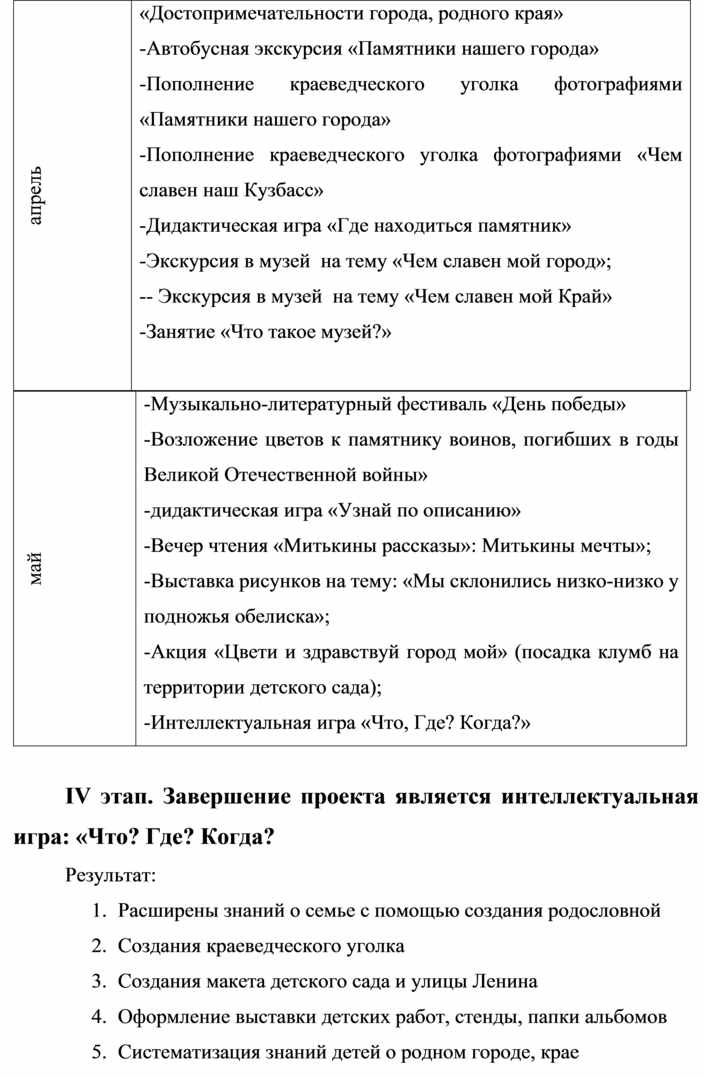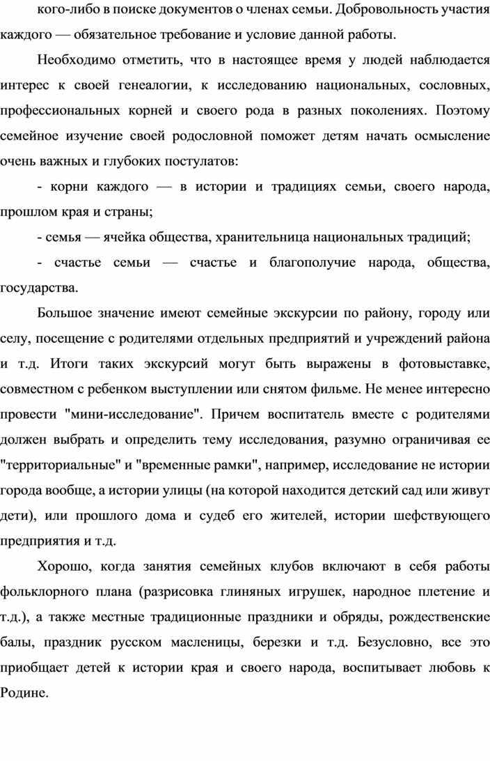 Большое значение имеют семейные экскурсии по району, городу или селу, посещение с родителями отдельных предприятий и учреждений района и т.д. Итоги таких экскурсий могут быть выражены в фотовыставке, совместном с ребенком выступлении или снятом фильме. Не менее интересно провести "мини-исследование". Причем воспитатель вместе с родителями должен выбрать и определить тему исследования, разумно ограничивая ее "территориальные" и "временные рамки", например, исследование не истории города вообще, а истории улицы (на которой находится детский сад или живут дети), или прошлого дома и судеб его жителей, истории шефствующего предприятия и т.д.