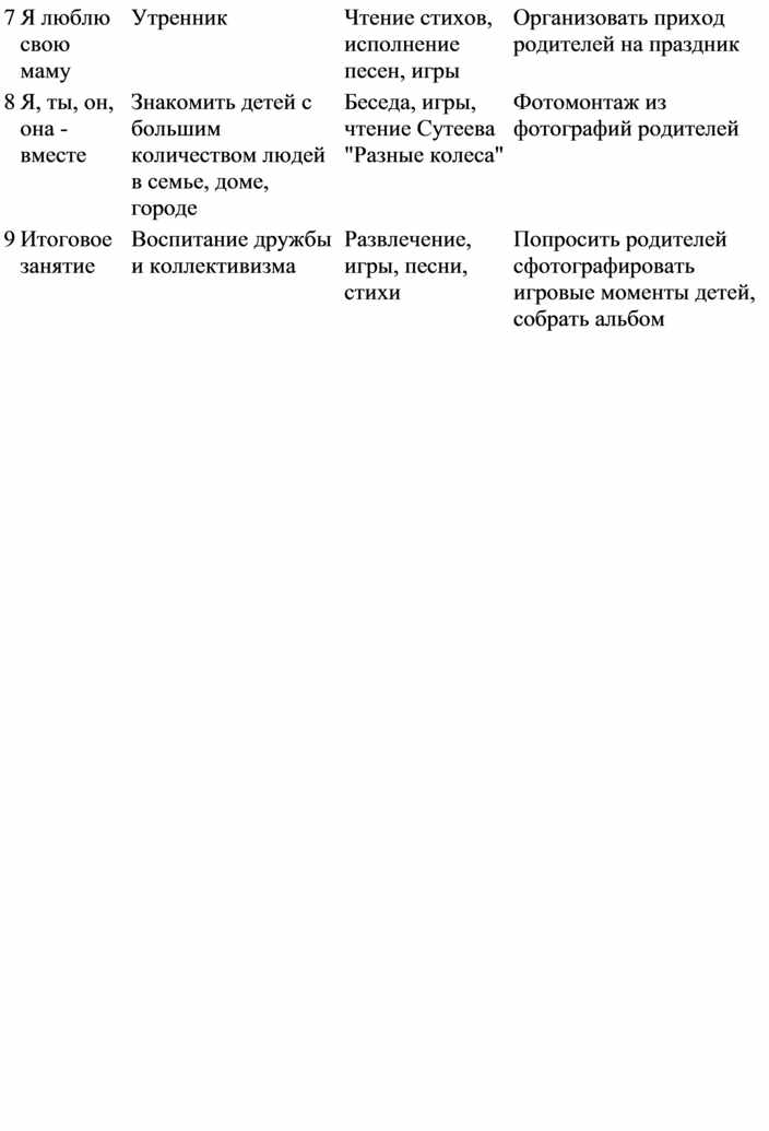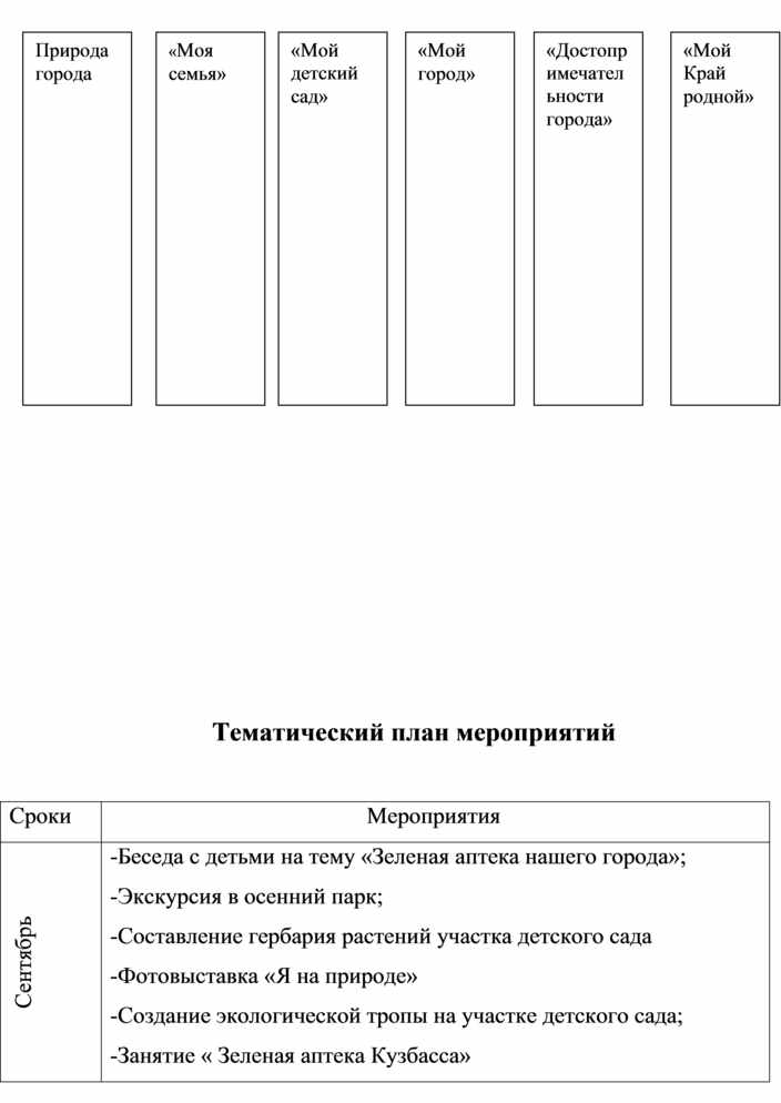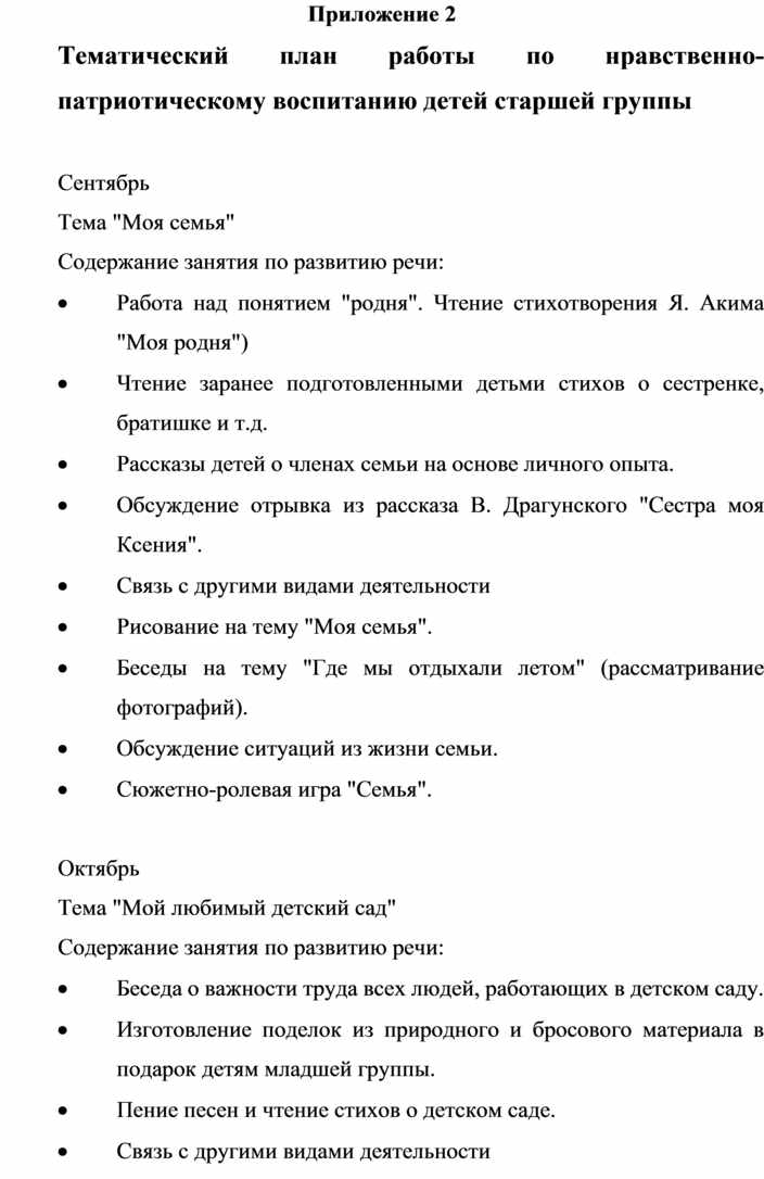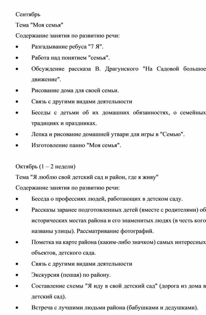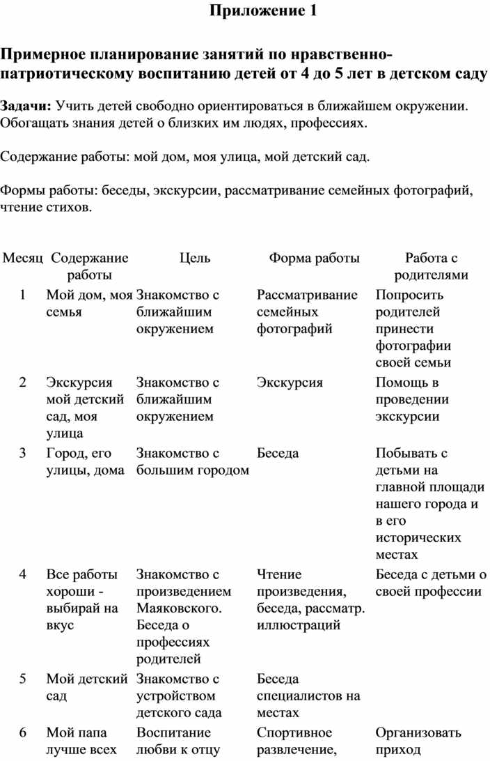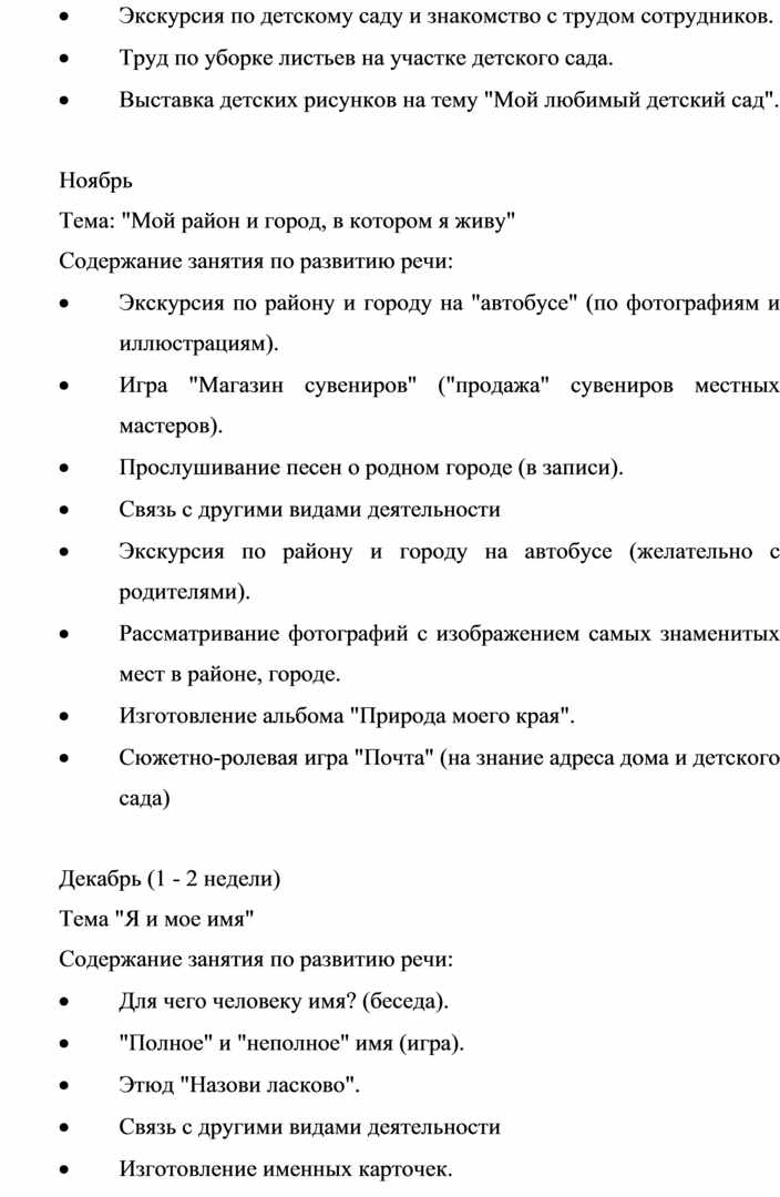 Планирование данной работы наиболее целесообразно по следующим темам: "Моя семья", "Моя улица", "Мой детский сад". Работа по каждой теме должна включать занятия, игры, экскурсии, нерегламентированную деятельность детей, по некоторым темам — праздники.