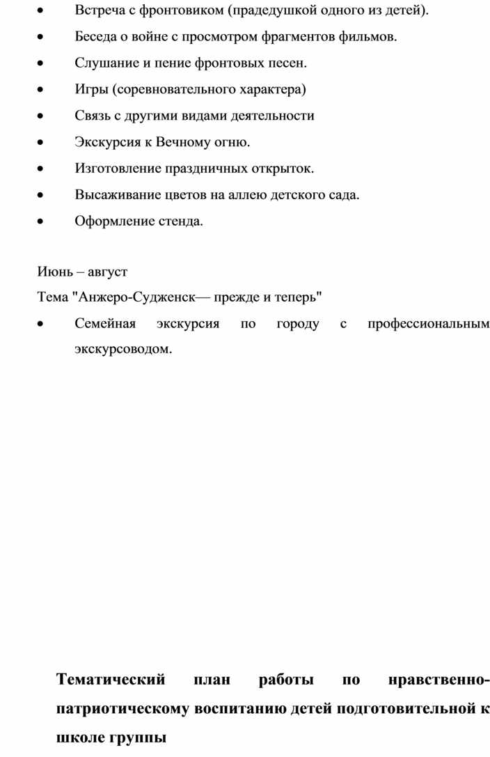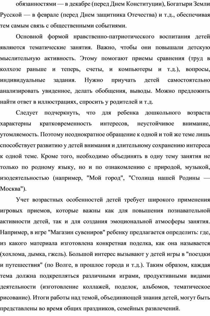 Основной формой нравственно-патриотического воспитания детей являются тематические занятия. Важно, чтобы они повышали детскую мыслительную активность. Этому помогают приемы сравнения (труд в колхозе раньше и теперь, счеты, и компьютеры и т.д.), вопросы, индивидуальные задания. Нужно приучать детей самостоятельно анализировать увиденное, делать обобщения, выводы. Можно предложить найти ответ в иллюстрациях, спросить у родителей и т.д.