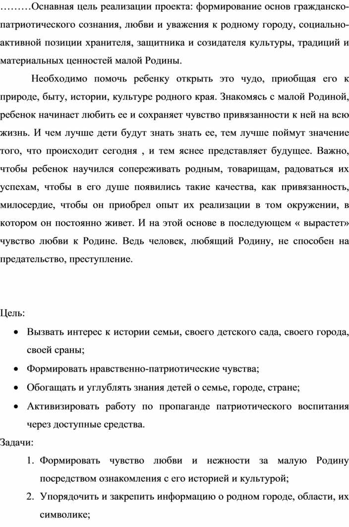 Патриотическое воспитание детей является одной из основных задач дошкольного учреждения. Чувство патриотизма многогранно по содержанию. Это и любовь к родным местам, и гордость за свой народ, и ощущение своей неразрывности с окружающим миром, и желание сохранять и приумножить богатство своей страны. Поэтому нашей задачей, как педагогов является: воспитание у ребенка любви и привязанности к своей семье, дому, детскому саду, улице, городу; формирование бережного отношения к природе и всему живому; воспитание уважения к труду; развитие интереса к русским традициям и промыслам; формирование элементарных знаний о правах человека; расширение представлений о городах (смотря, где живет ребенок); знакомство детей с символами государства (герб, флаг, гимн); развитие чувства ответственности и гордости за достижения страны; формирование толерантности, чувства уважения к другим народам, их традициям. Данные задачи решаются во всех видах детской деятельности: на занятиях, в играх, в труде, в быту.