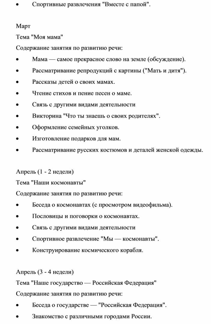 Следует подчеркнуть, что для ребенка дошкольного возраста характерны кратковременность интересов, неустойчивое внимание, утомляемость. Поэтому неоднократное обращение к одной и той же теме лишь способствует развитию у детей внимания и длительному сохранению интереса к одной теме. Кроме того, необходимо объединять в одну тему занятия не только по родному языку, но и по ознакомлению с природой, музыкой, изодеятельностью (например, "Мой город", "Столица нашей Родины — Москва").