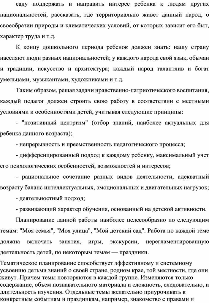 Таким образом, решая задачи нравственно-патриотического воспитания, каждый педагог должен строить свою работу в соответствии с местными условиями и особенностями детей, учитывая следующие принципы: