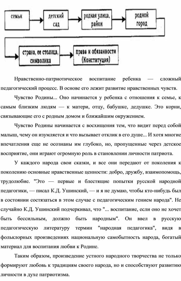 У каждого народа свои сказки, и все они передают от поколения к поколению основные нравственные ценности: добро, дружбу, взаимопомощь, трудолюбие. "Это — первые и блестящие попытки русской народной педагогики, — писал К.Д. Ушинский, — и я не думаю, чтобы кто-нибудь был в состоянии состязаться в этом случае с педагогическим гением народа". Не случайно К.Д. Ушинский подчеркивал, что "... воспитание, если оно не хочет быть бессильным, должно быть народным". Он ввел в русскую педагогическую литературу термин "народная педагогика", видя в фольклорных произведениях национальную самобытность народа, богатый материал для воспитания любви к Родине.