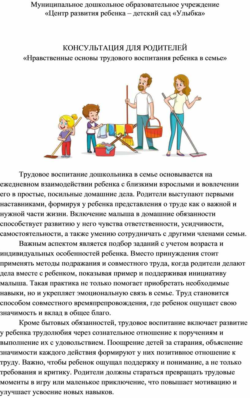 Таким образом, трудовое воспитание дошкольника в семье строится на основе совместной деятельности, учитывает возрастные и индивидуальные особенности ребенка, направлено на формирование положительного отношения к труду и развитие личностных качеств. Работа родителей, их компетентность и взаимодействие с воспитателями играют ключевые роли в успешном формировании трудовой культуры у ребенка. В дальнейшем текст работы подробно рассмотрит значение трудового воспитания в семейном воспитательном процессе, конкретные методы и цели, а также пути повышения квалификации родителей и взаимодействия с образовательными учреждениями.