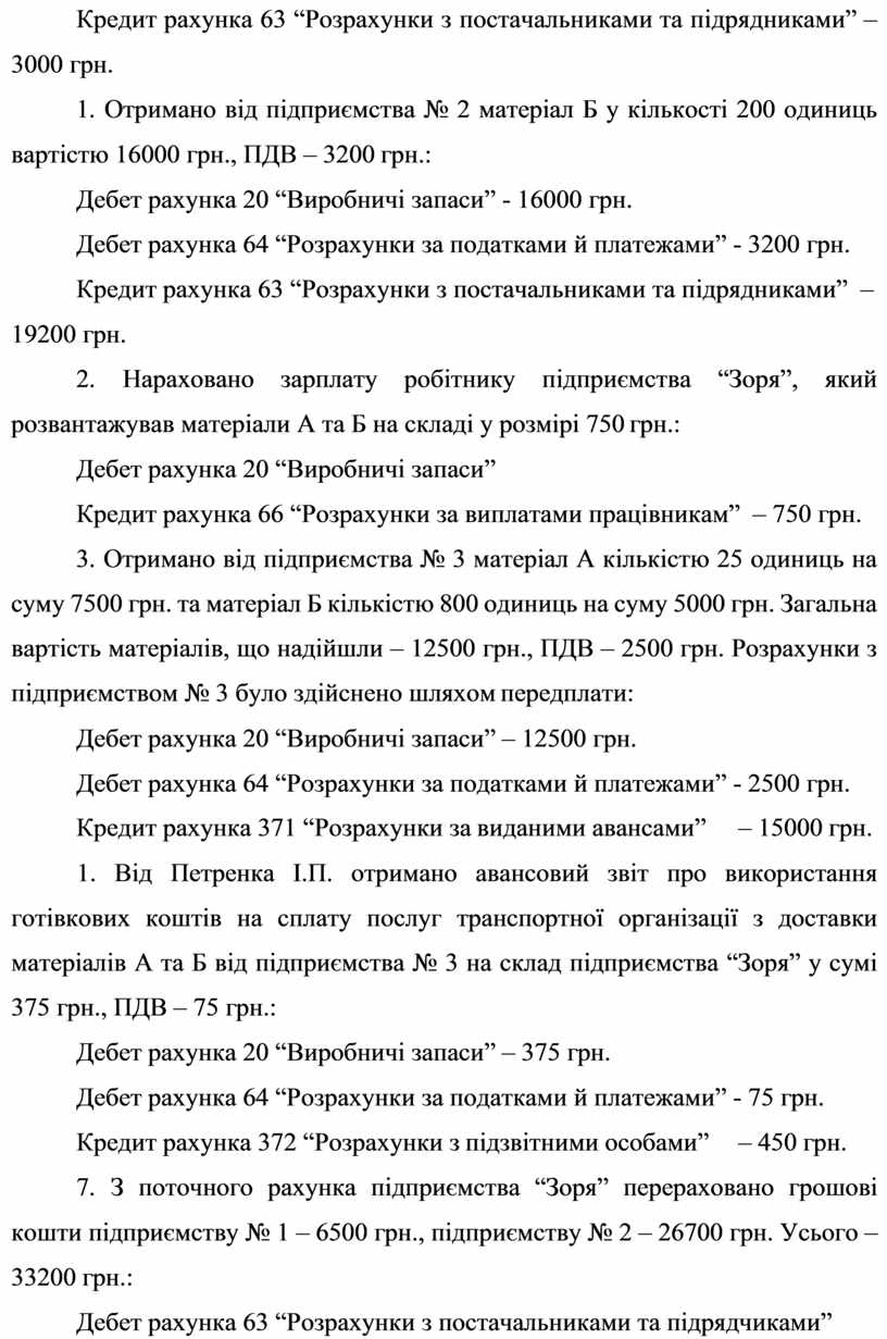 1. Від Петренка І.П. отримано авансовий звіт про використання готівкових коштів на сплату послуг транспортної організації з доставки матеріалів А та Б від підприємства № 3 на склад підприємства “Зоря” у сумі 375 грн., ПДВ – 75 грн.: