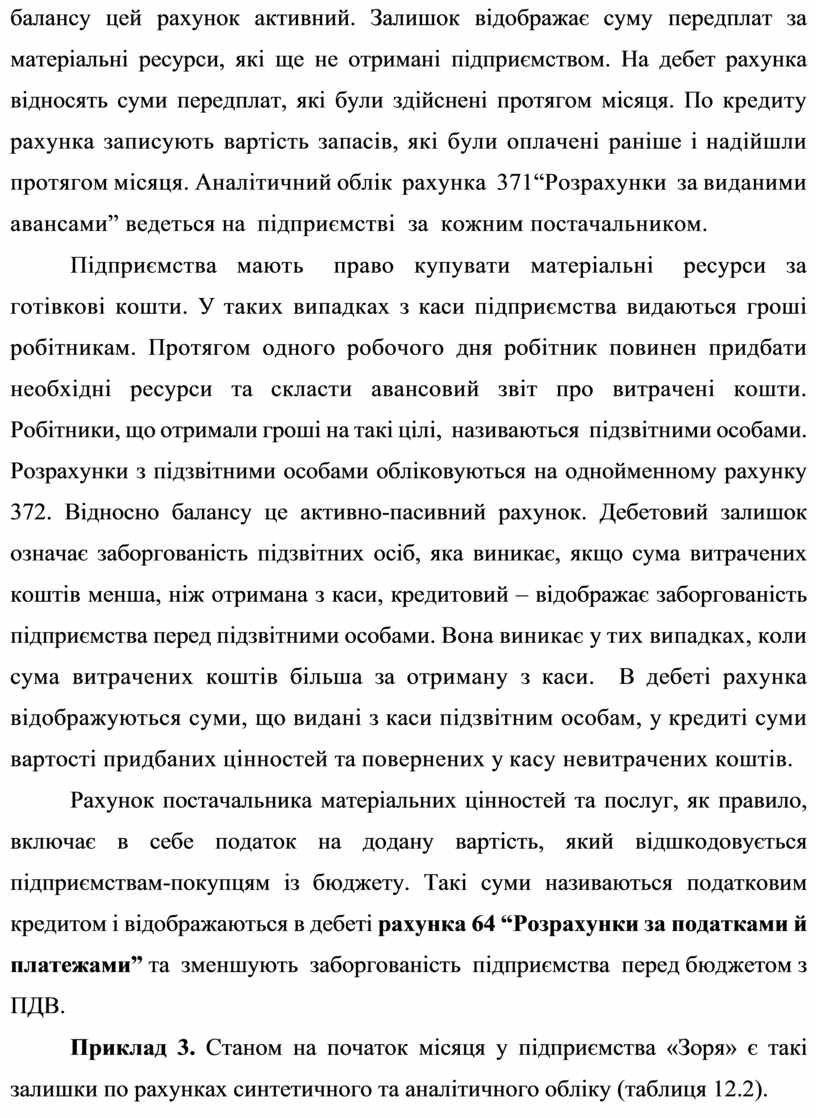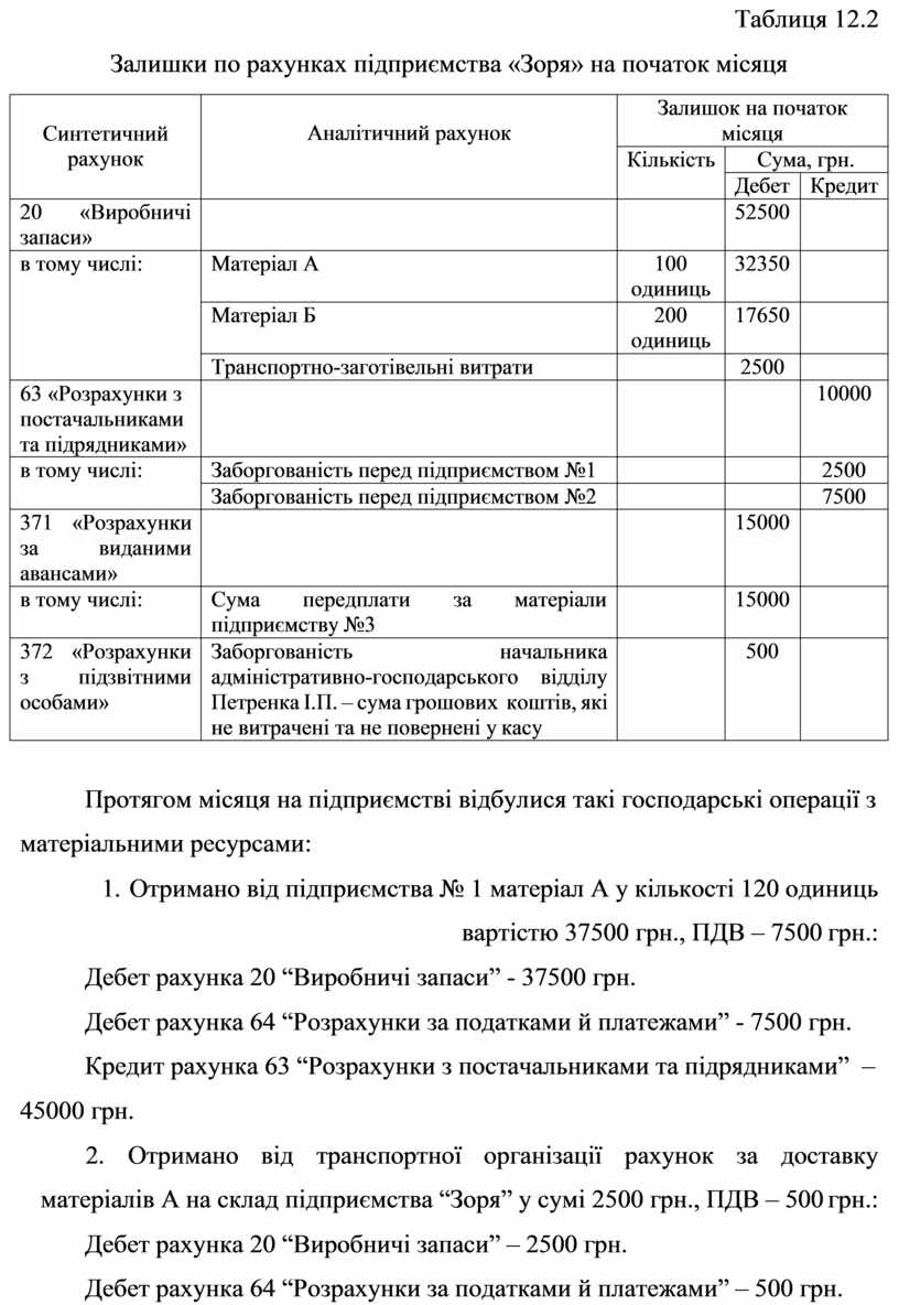 Приклад 3. Станом на початок місяця у підприємства «Зоря» є такі залишки по рахунках синтетичного та аналітичного обліку (таблиця 12.2).