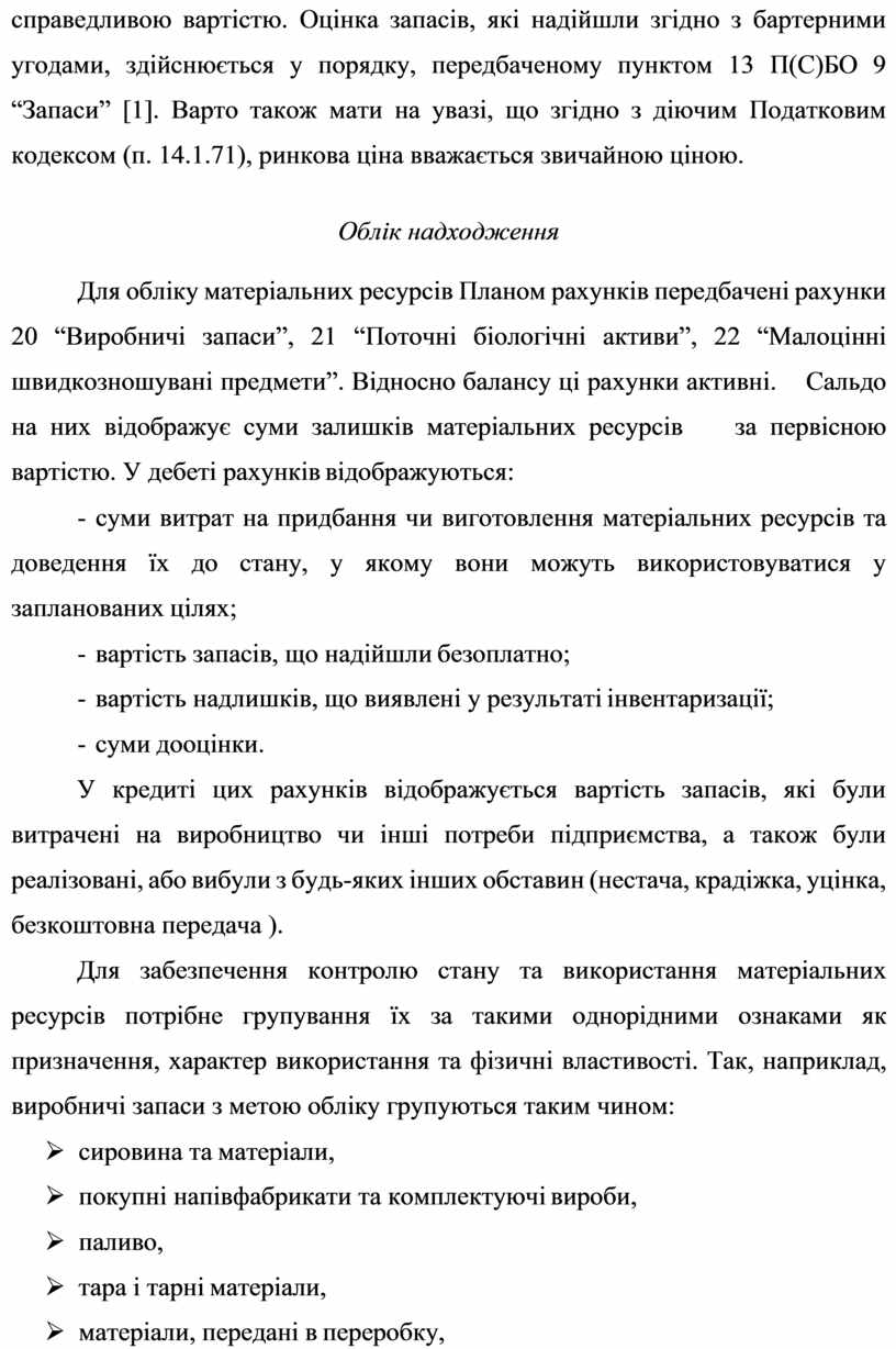 справедливою вартістю. Оцінка запасів, які надійшли згідно з бартерними угодами, здійснюється у порядку, передбаченому пунктом 13 П(С)БО 9 “Запаси” [1]. Варто також мати на увазі, що згідно з діючим Податковим кодексом (п. 14.1.71), ринкова ціна вважається звичайною ціною.