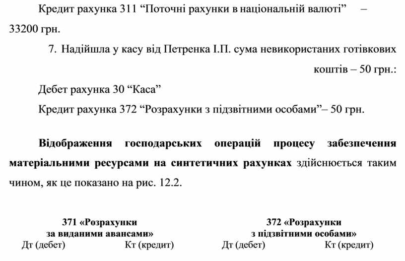 Підприємства мають право купувати матеріальні ресурси за готівкові кошти. У таких випадках з каси підприємства видаються гроші робітникам. Протягом одного робочого дня робітник повинен придбати необхідні ресурси та скласти авансовий звіт про витрачені кошти. Робітники, що отримали гроші на такі цілі, називаються підзвітними особами. Розрахунки з підзвітними особами обліковуються на однойменному рахунку 372. Відносно балансу це активно-пасивний рахунок. Дебетовий залишок означає заборгованість підзвітних осіб, яка виникає, якщо сума витрачених коштів менша, ніж отримана з каси, кредитовий – відображає заборгованість підприємства перед підзвітними особами. Вона виникає у тих випадках, коли сума витрачених коштів більша за отриману з каси. В дебеті рахунка відображуються суми, що видані з каси підзвітним особам, у кредиті суми вартості придбаних цінностей та повернених у касу невитрачених коштів.