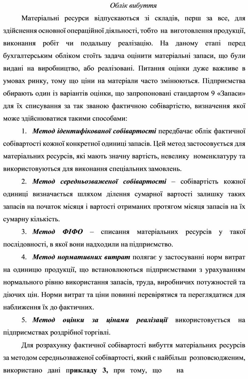 1. Метод ідентифікованої собівартості передбачає облік фактичної собівартості кожної конкретної одиниці запасів. Цей метод застосовується для матеріальних ресурсів, які мають значну вартість, невелику номенклатуру та використовуються для виконання спеціальних замовлень.