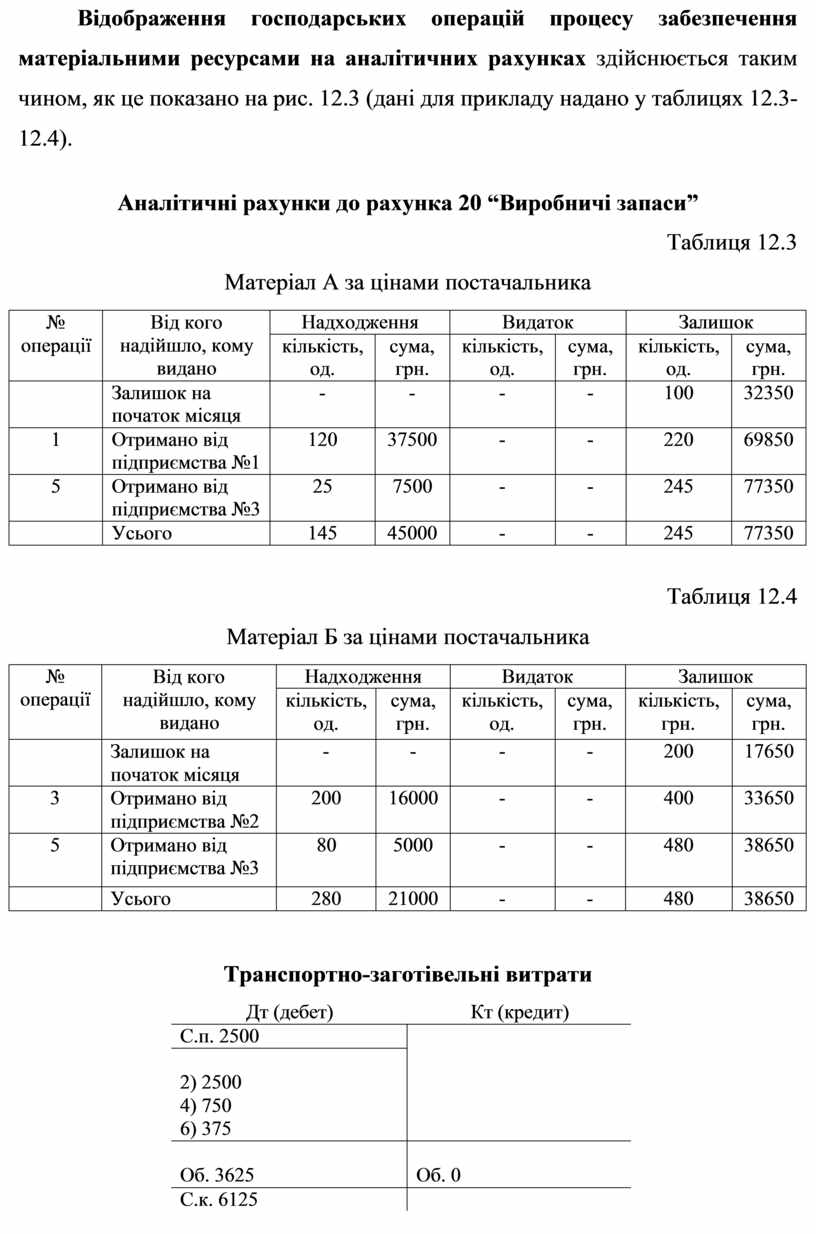 Рис. 12.3. Відображення на рахунках аналітичного обліку господарських операцій процесу забезпечення підприємства матеріальними