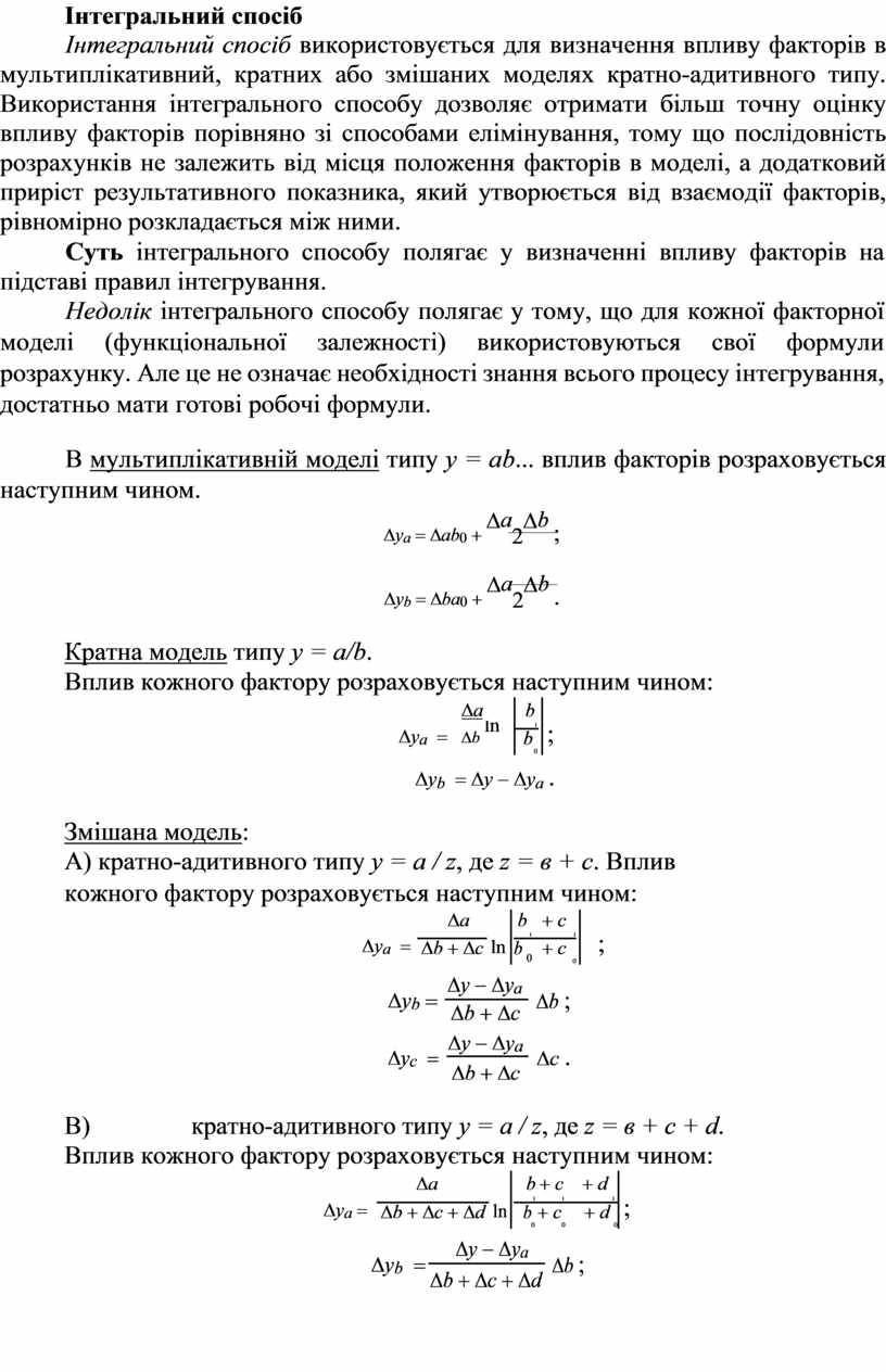Недолік інтегрального способу полягає у тому, що для кожної факторної моделі (функціональної залежності) використовуються свої формули розрахунку. Але це не означає необхідності знання всього процесу інтегрування, достатньо мати готові робочі формули.