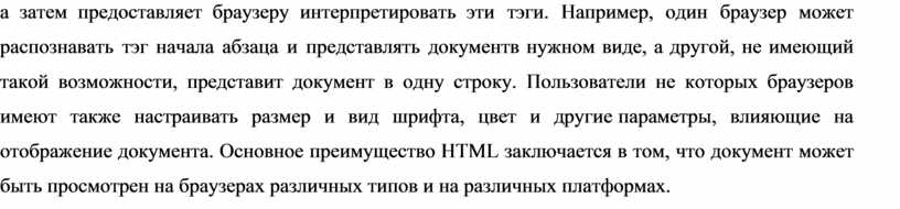 Большинство документов имеют стандартные элементы, например, такие, как заголовки, параграфы или списки. Используя тэги (команды) НТМL, можно обозначать данные элементы, обеспечивая браузеры информацией для их отображения, сохраняя в целом общую структуру и информационную полноту документов. В большинстве случаев (например, при использовании различных текстовых редакторов) автор строго определяет внешний вид документа. В случае HTML (основываясь на возможностях браузера) можно в определенной степени управлять внешним видом (но не его содержимым). НТМL позволяет отметить, где в документе должен быть заголовок или абзац, при помощи тэгов НТМL, а затем предоставляет браузеру интерпретировать эти тэги. Например, один браузер может распознавать тэг начала абзаца и представлять документ в нужном виде, а другой, не имеющий такой возможности, представит документ в одну строку. Пользователи не которых браузеров имеют также настраивать размер и вид шрифта, цвет и другие параметры, влияющие на отображение документа. Основное преимущество НТМL заключается в том, что документ может быть просмотрен на браузерах различных типов и на различных платформах.
