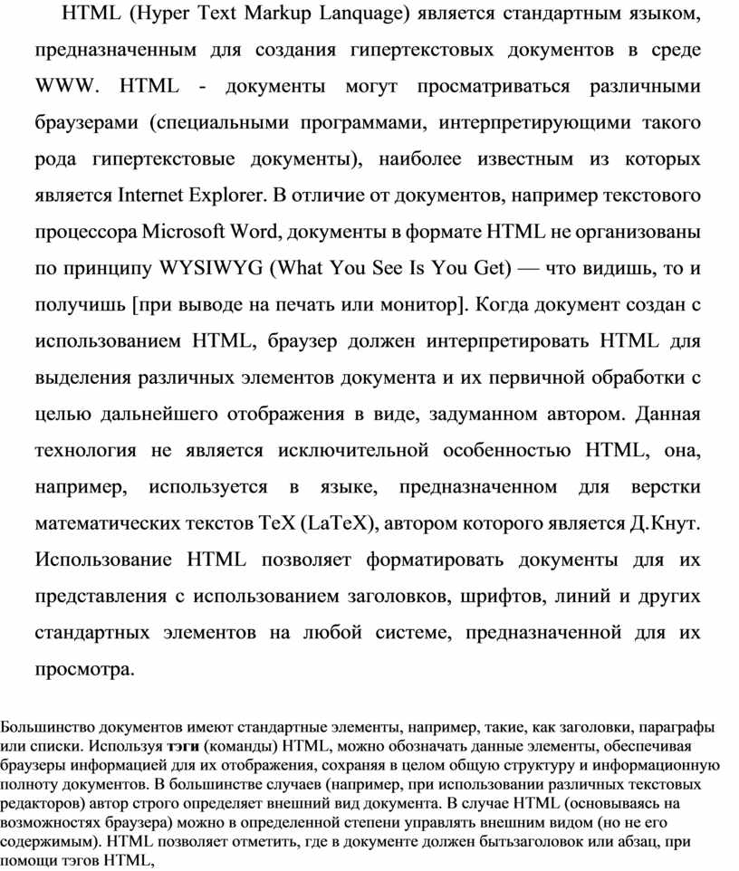 НТМL (Нуреr Техt Маrkup Lanquage) является стандартным языком, предназначенным для создания гипертекстовых документов в среде WWW. НТМL - документы могут просматриваться различными браузерами (специальными программами, интерпретирующими такого рода гипертекстовые документы), наиболее известным из которых является Internet Explorer. В отличие от документов, например текстового процессора Microsoft Word, документы в формате HTML не организованы по принципу WYSIWYG (What You See Is You Get) — что видишь, то и получишь [при выводе на печать или монитор]. Когда документ создан с использованием НТМL, браузер должен интерпретировать HTML для выделения различных элементов документа и их первичной обработки с целью дальнейшего отображения в виде, задуманном автором. Данная технология не является исключительной особенностью HTML, она, например, используется в языке, предназначенном для верстки математических текстов ТеХ (LaТеХ), автором которого является Д. Кнут. Использование HTML позволяет форматировать документы для их представления с использованием заголовков, шрифтов, линий и других стандартных элементов на любой системе, предназначенной для их просмотра.
