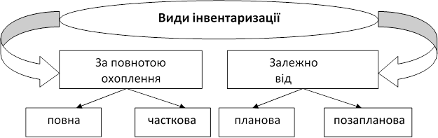 За повнотою охоплення перевіркою засобів, коштів і розрахунків, інвентаризацію поділяють на повну і часткову. Залежно від характеру інвентаризацію поділяють на планову і позапланову (рис. 5.7).