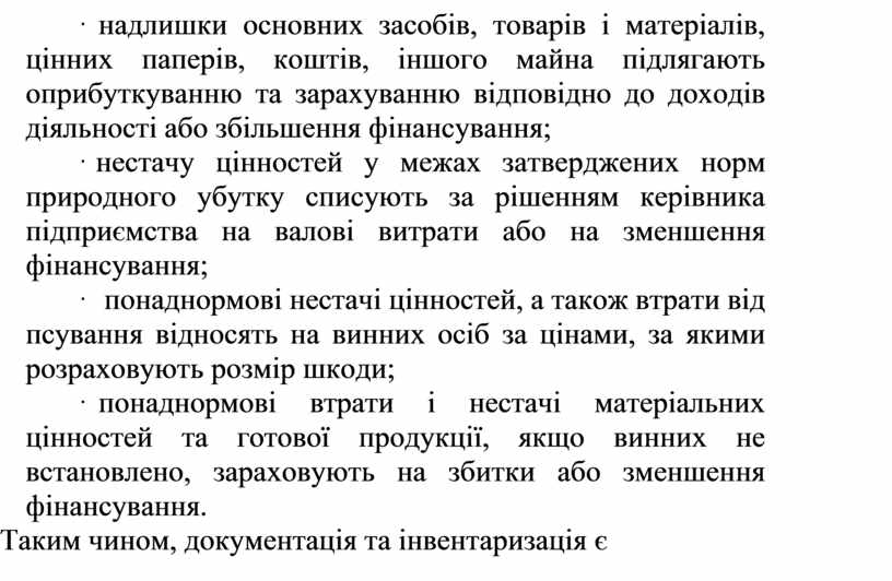 Інвентаризація дає змогу встановити розходження між даними обліку і фактичною наявністю засобів, тобто лишки або нестачі, які оформляють відповідними документами і відображають в обліку.