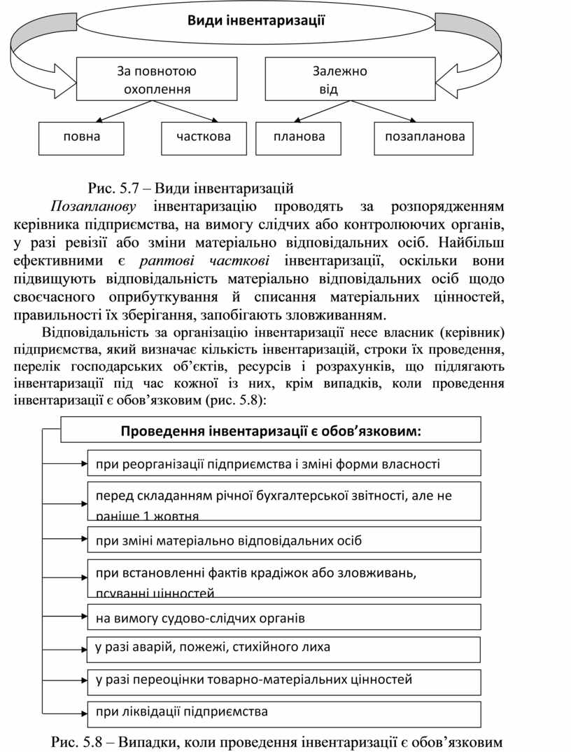 Відповідальність за організацію інвентаризації несе власник (керівник) підприємства, який визначає кількість інвентаризацій, строки їх проведення, перелік господарських об’єктів, ресурсів і розрахунків, що підлягають інвентаризації під час кожної із них, крім випадків, коли проведення інвентаризації є обов’язковим (рис. 5.8):