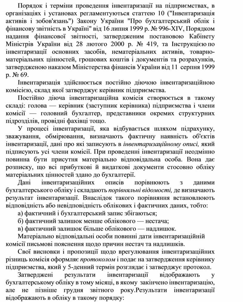 Порядок і терміни проведення інвентаризації на підприємствах, в організаціях і установах регламентуються статтею 10 ("Інвентаризація активів і зобов'язань") Закону України "Про бухгалтерський облік і фінансову звітність в Україні" від 16 липня 1999 p. № 996-XIV, Порядком надання фінансової звітності, затвердженим постановою Кабінету Міністрів України від 28 лютого 2000 р. № 419, та Інструкцією по інвентаризації основних засобів, нематеріальних активів, товарно- матеріальних цінностей, грошових коштів і документів та розрахунків, затвердженою наказом Міністерства фінансів України від 11 серпня 1999 р. № 69.
