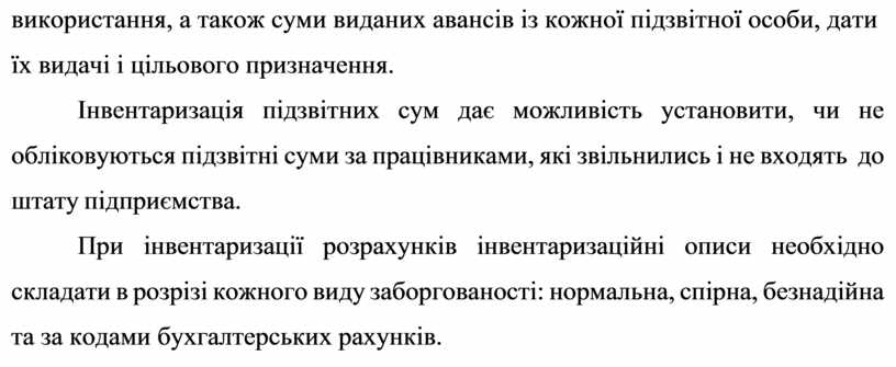 Інвентаризація підзвітних сум дає можливість установити, чи не обліковуються підзвітні суми за працівниками, які звільнились і не входять до штату підприємства.
