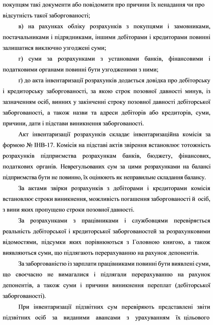 Акт інвентаризації розрахунків складає інвентаризаційна комісія за формою № ІНВ-17. Комісія на підставі актів звірення встановлює тотожність розрахунків підприємства розрахункам банків, бюджету, фінансових, податкових органів. Неврегульованих сум за цими розрахунками на балансі підприємства бути не повинно, їх оцінюють як неправильне складання балансу.