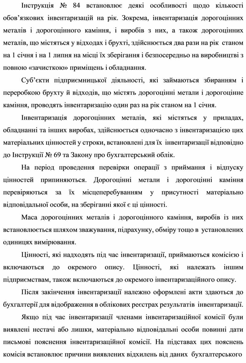 Інструкція № 84 встановлює деякі особливості щодо кількості обов’язкових інвентаризацій на рік. Зокрема, інвентаризація дорогоцінних металів і дорогоцінного каміння, і виробів з них, а також дорогоцінних металів, що містяться у відходах і брухті, здійснюється два рази на рік станом на 1 січня і на 1 липня на місці їх зберігання і безпосередньо на виробництві з повною «зачисткою» приміщень і обладнання.