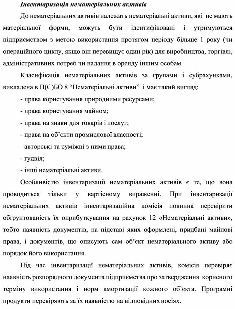 Особливістю інвентаризації нематеріальних активів є те, що вона проводиться тільки у вартісному вираженні. При інвентаризації нематеріальних активів інвентаризаційна комісія повинна перевірити обґрунтованість їх оприбуткування на рахунок 12 «Нематеріальні активи», тобто наявність документів, на підставі яких оформлені, придбані майнові права, і документів, що описують сам об’єкт нематеріального активу або порядок його використання.