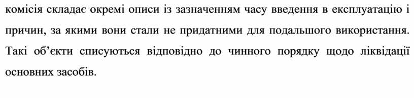 комісія складає окремі описи із зазначенням часу введення в експлуатацію і причин, за якими вони стали не придатними для подальшого використання. Такі об’єкти списуються відповідно до чинного порядку щодо ліквідації основних засобів.