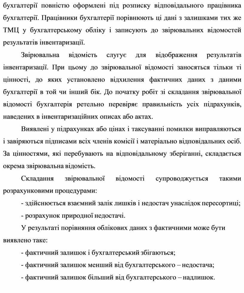 бухгалтерії повністю оформлені під розписку відповідального працівника бухгалтерії. Працівники бухгалтерії порівнюють ці дані з залишками тих же ТМЦ у бухгалтерському обліку і записують до звірювальних відомостей результатів інвентаризації.