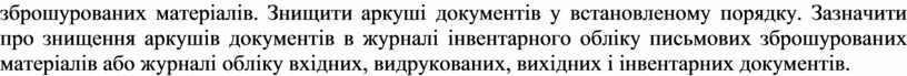 підібрати та скомплектувати матеріали вхідних документів, зареєструвати документи, в журналі інвентарного обліку письмових зброшурованих матеріалів, проставлення інвентарного номера на документі, завірити підпис працівника, що проводить реєстрацію.
