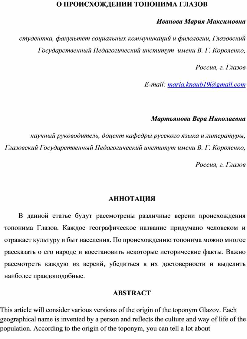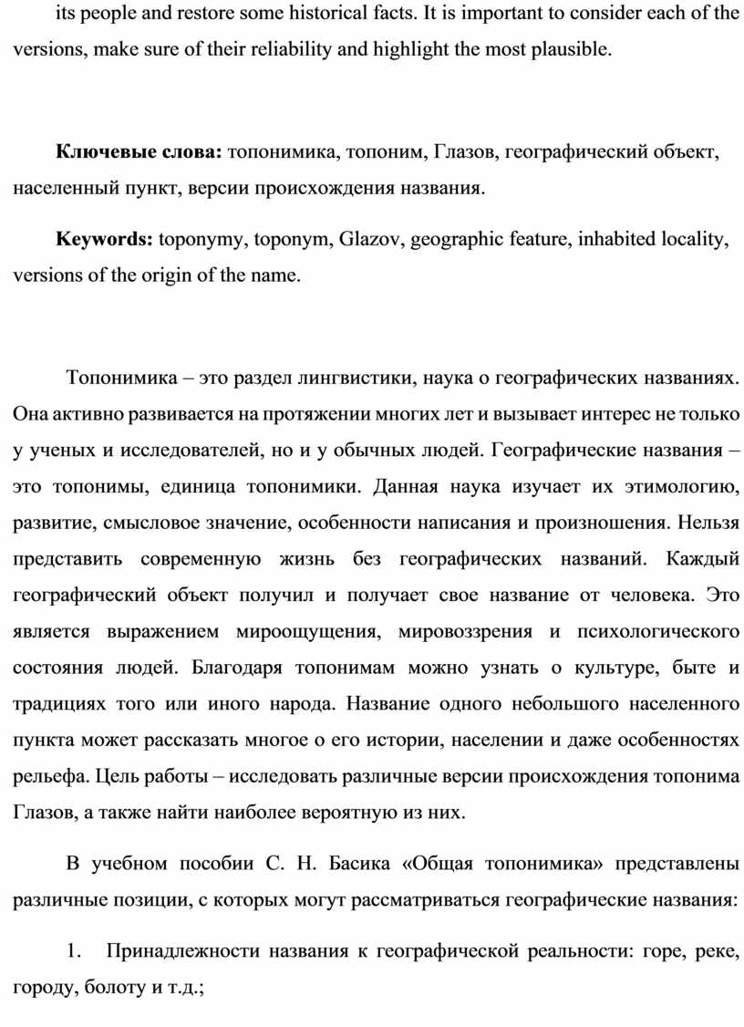 Ключевые слова: топонимика, топоним, Глазов, географический объект, населенный пункт, версии происхождения названия.