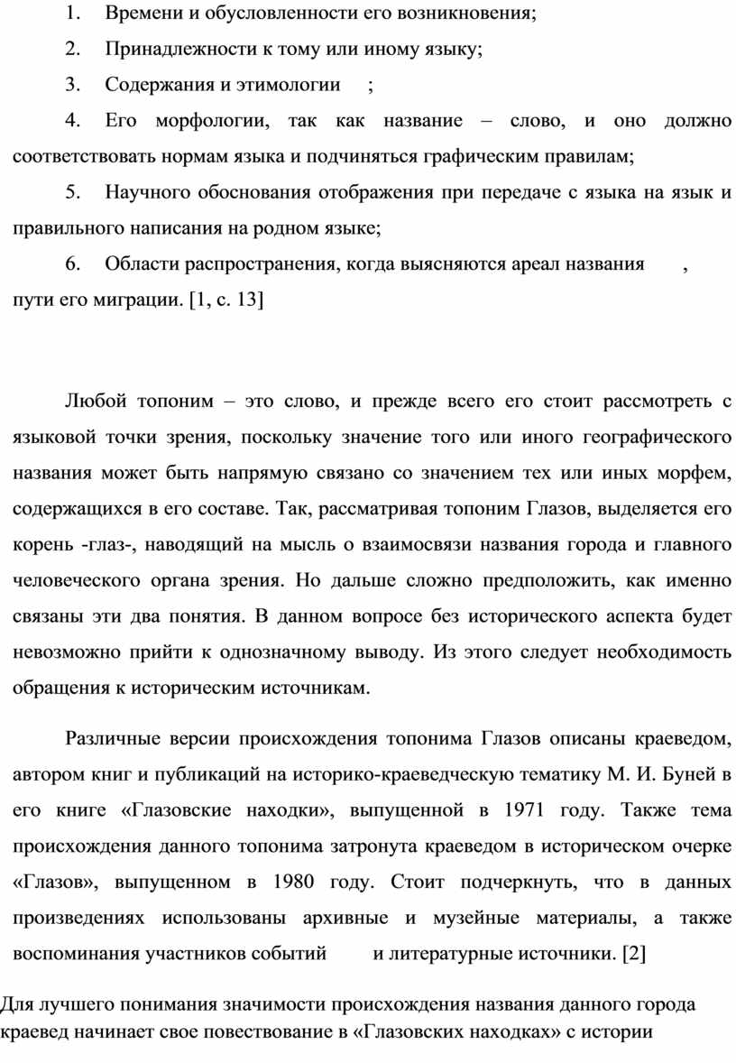 Любой топоним – это слово, и прежде всего его стоит рассмотреть с языковой точки зрения, поскольку значение того или иного географического названия может быть напрямую связано со значением тех или иных морфем, содержащихся в его составе. Так, рассматривая топоним Глазов, выделяется его корень -глаз-, наводящий на мысль о взаимосвязи названия города и главного человеческого органа зрения. Но дальше сложно предположить, как именно связаны эти два понятия. В данном вопросе без исторического аспекта будет невозможно прийти к однозначному выводу. Из этого следует необходимость обращения к историческим источникам.