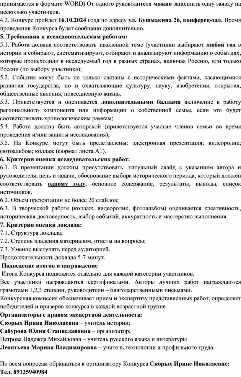 4.2. Конкурс пройдет 16.10.2024 года по адресу ул. Бушмакина 26, конферец-зал. Время проведения Конкурса будет сообщено дополнительно.