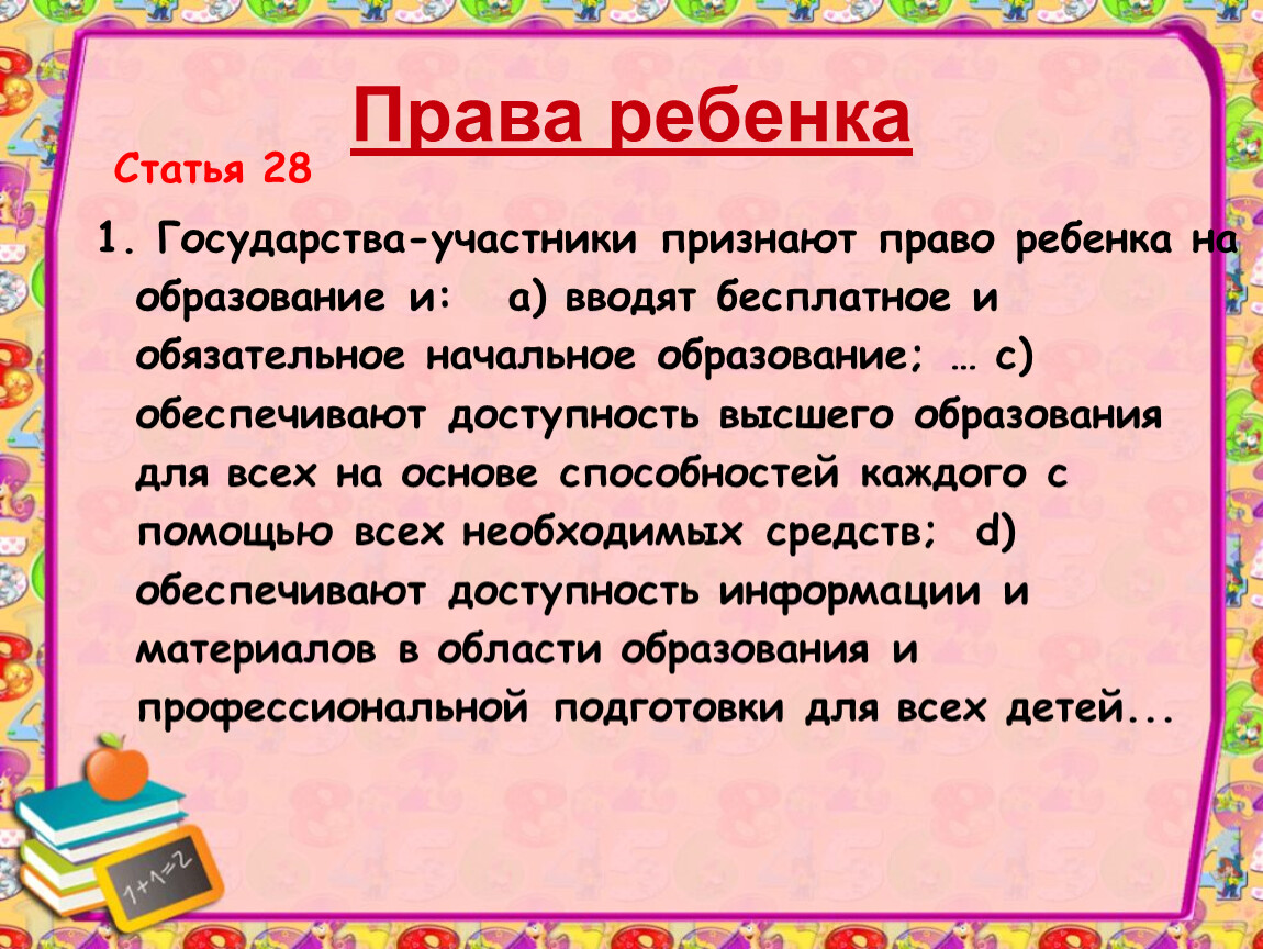 1. Государства-участники признают право ребенка на образование и: a) вводят бесплатное и обязательное начальное образование; … c) обеспечивают доступность высшего образования для всех на основе способностей каждого с помощью всех необходимых средств; d) обеспечивают доступность информации и материалов в области образования и профессиональной подготовки для всех детей...