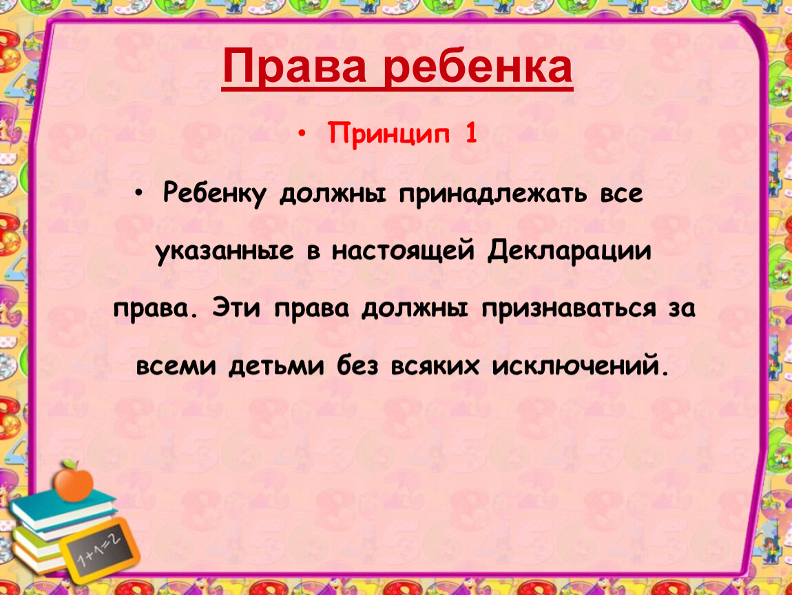 Ребенку должны принадлежать все указанные в настоящей Декларации права. Эти права должны признаваться за всеми детьми без всяких исключений.