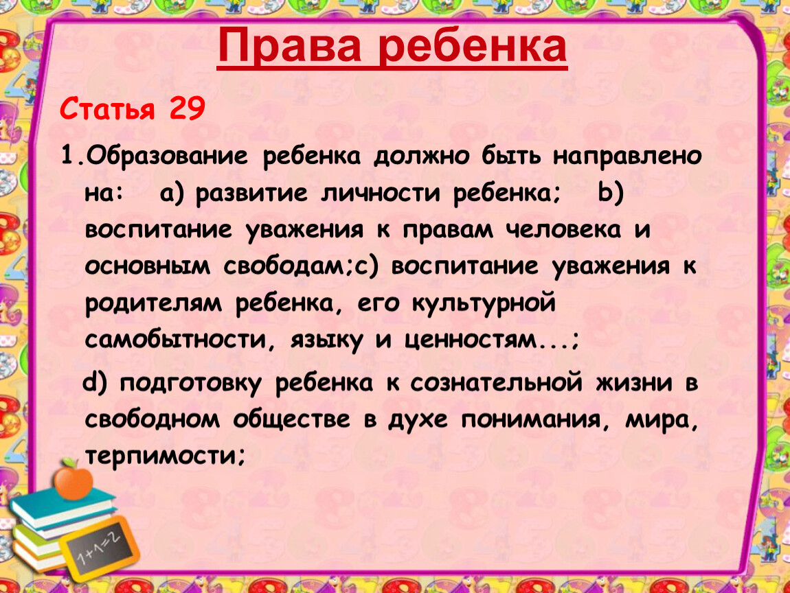 1.Образование ребенка должно быть направлено на: a) развитие личности ребенка; b) воспитание уважения к правам человека и основным свободам;c) воспитание уважения к родителям ребенка, его культурной самобытности, языку и ценностям...;