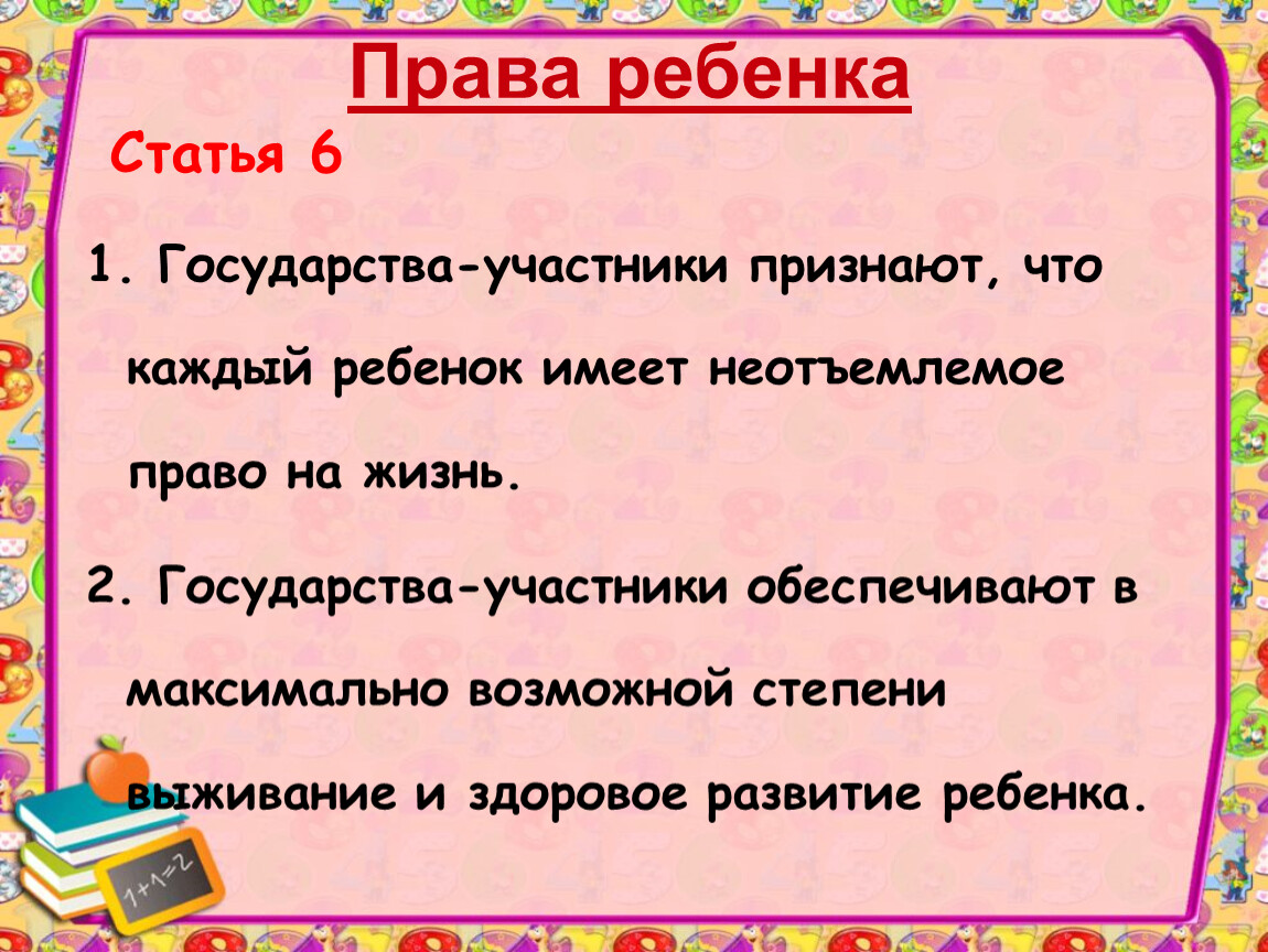 1. Государства-участники признают, что каждый ребенок имеет неотъемлемое право на жизнь.