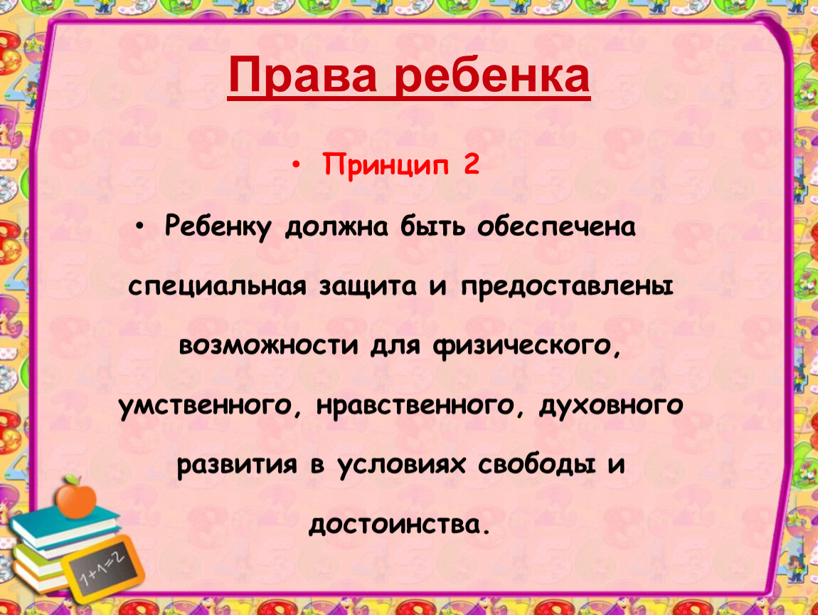 Ребенку должна быть обеспечена специальная защита и предоставлены возможности для физического, умственного, нравственного, духовного развития в условиях свободы и достоинства.
