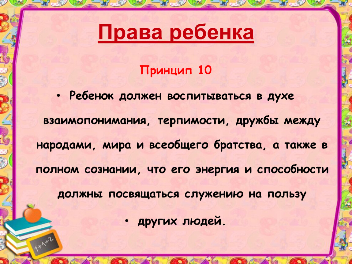 Ребенок должен воспитываться в духе взаимопонимания, терпимости, дружбы между народами, мира и всеобщего братства, а также в полном сознании, что его энергия и способности должны посвящаться служению на пользу