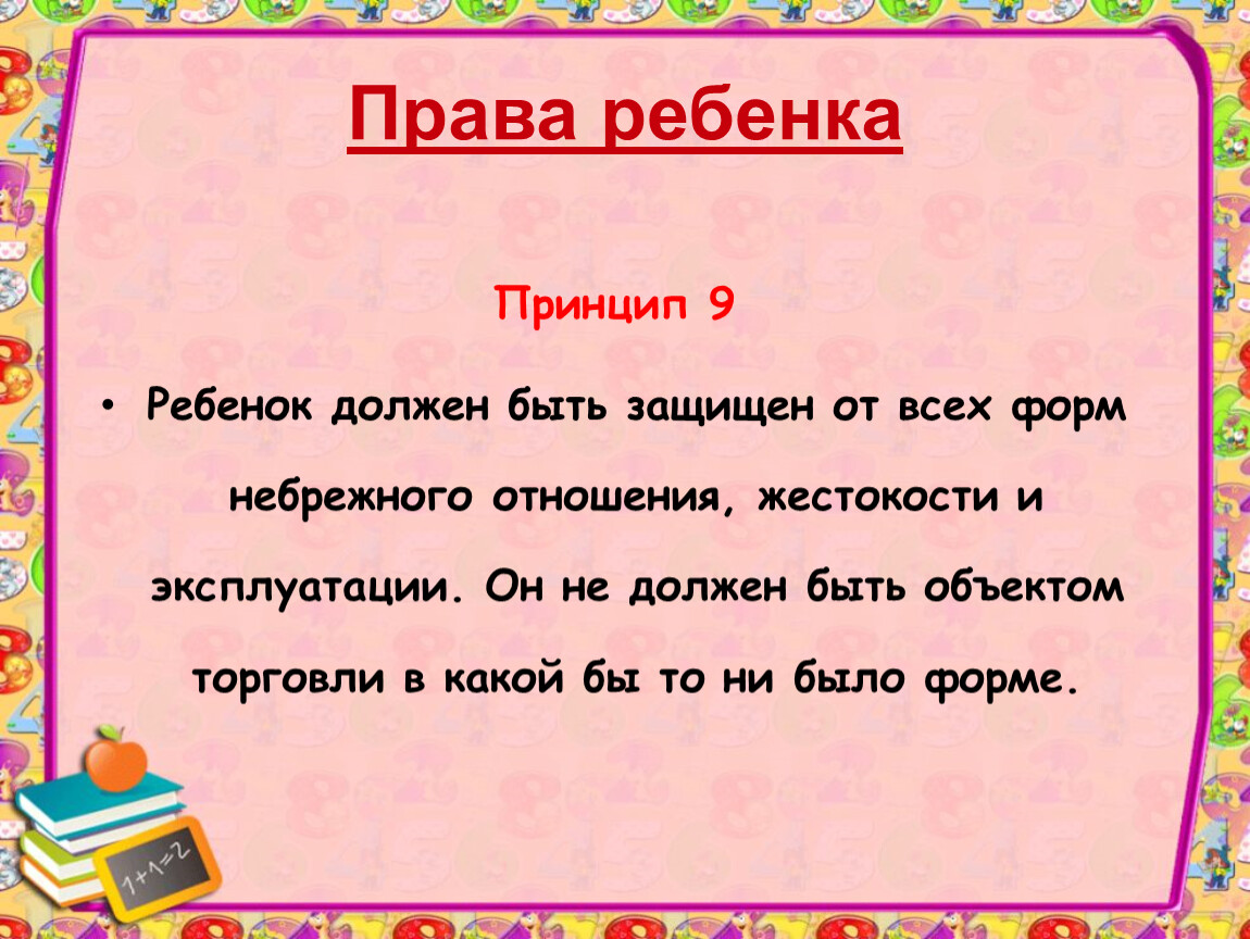 Ребенок должен быть защищен от всех форм небрежного отношения, жестокости и эксплуатации. Он не должен быть объектом торговли в какой бы то ни было форме.