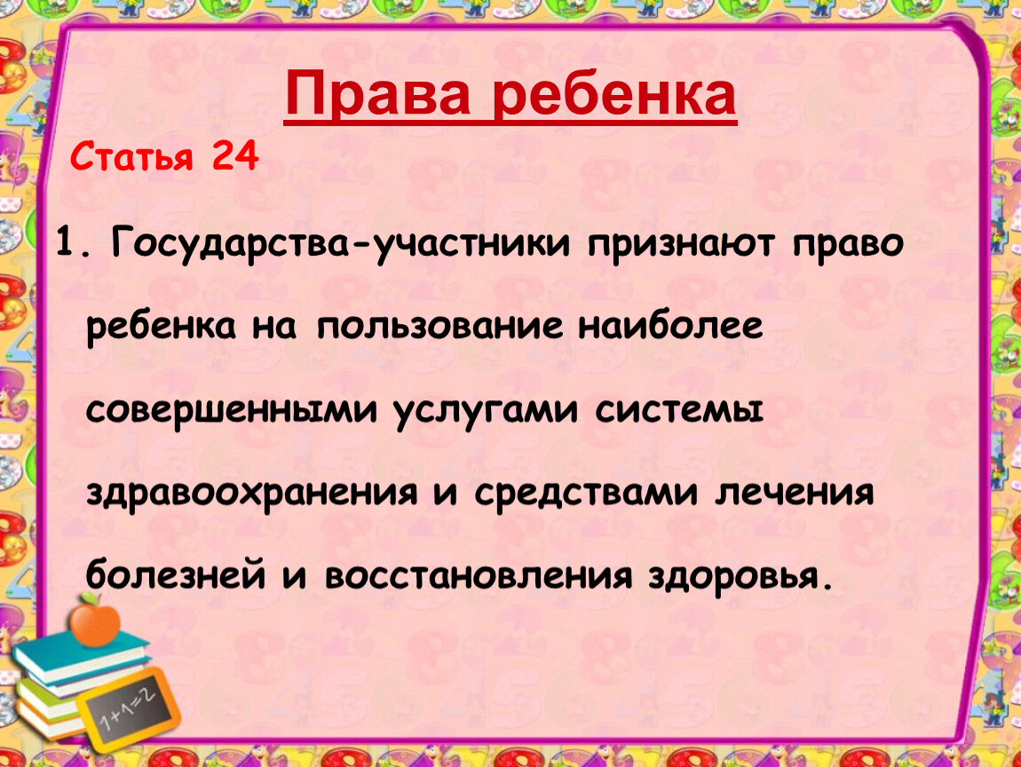 1. Государства-участники признают право ребенка на пользование наиболее совершенными услугами системы здравоохранения и средствами лечения болезней и восстановления здоровья.