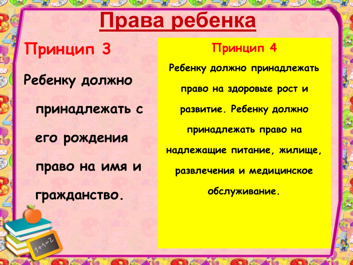 Ребенку должно принадлежать право на здоровые рост и развитие. Ребенку должно принадлежать право на надлежащие питание, жилище, развлечения и медицинское обслуживание.