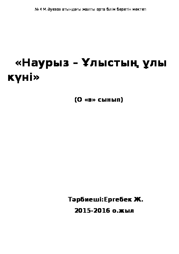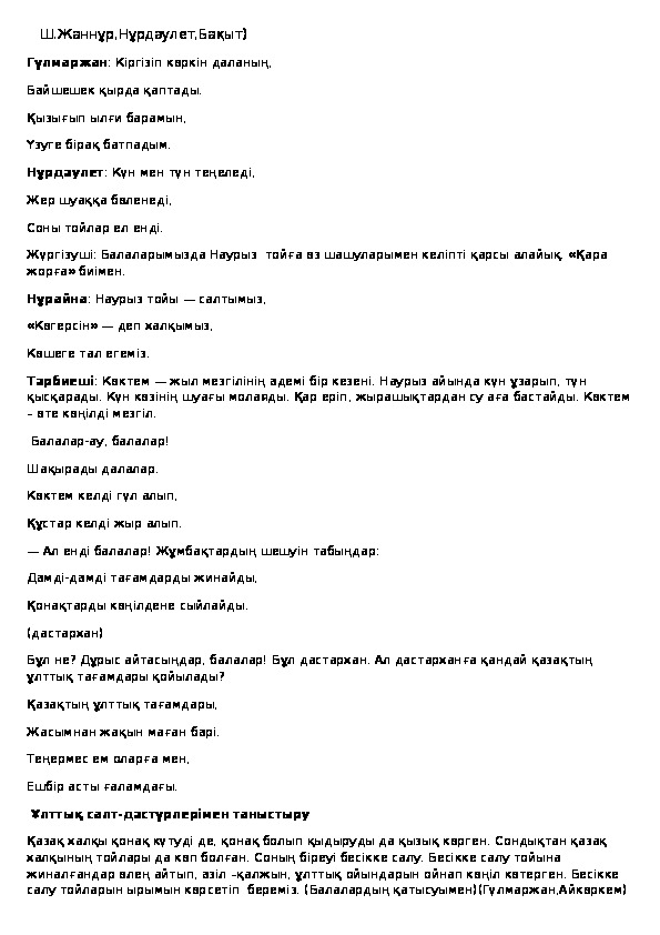 . — Сәлеметсіздер ме, құрметті ата-аналар, балалар, қонақтар! Бүгінгі Наурыз мейрамына арналған «Наурыз –Ұлыстың ұлы күні» атты сын сабағымызды бастауға рұқсат етіңіздер!