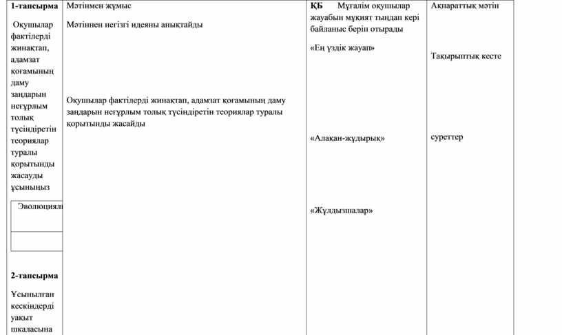 1-тапсырма Оқушылар фактілерді жинақтап, адамзат қоғамының даму заңдарын неғұрлым толық түсіндіретін теориялар туралы қорытынды жасауды ұсыныңыз