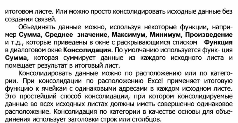 Объединять данные можно, используя некоторые функции, напри- мер Сумма, Среднее значение, Максимум, Минимум, Произведение и т.д., которые приведены в окне с раскрывающимся списком Функция в диалоговом окне Консолидация. По умолчанию используется функ- ция Сумма, которая суммирует данные из каждого исходного листа и помещает результат в итоговый лист.
