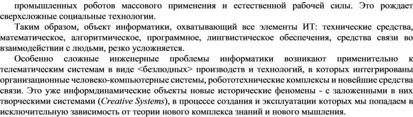 Особенно сложные инженерные проблемы информатики возникают применительно к телематическим системам в виде <безлюдных> производств и технологий, в которых интегрированы организационные человеко-компьютерные системы, робототехнические комплексы и новейшие средства связи. Это уже информдинамические объекты новые исторические феномены - с заложенными в них творческими системами (Creative Systems), в процессе создания и эксплуатации которых мы попадаем в исключительную зависимость от теории нового комплекса знаний и нового мышления.