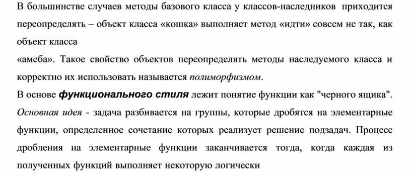 В большинстве случаев методы базового класса у классов-наследников приходится переопределять – объект класса «кошка» выполняет метод «идти» совсем не так, как объект класса