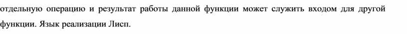 отдельную операцию и результат работы данной функции может служить входом для другой функции. Язык реализации Лисп.