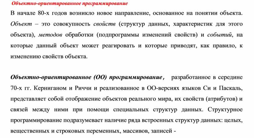 Объектно-ориентированное (ОО) программирование, разработанное в середине 70-х гг. Керниганом и Риччи и реализованное в ОО-версиях языков Си и Паскаль, представляет собой отображение объектов реального мира, их свойств (атрибутов) и связей между ними при помощи специальных структур данных. Структурное программирование подразумевает наличие ряда встроенных структур данных: целых, вещественных и строковых переменных, массивов, записей -