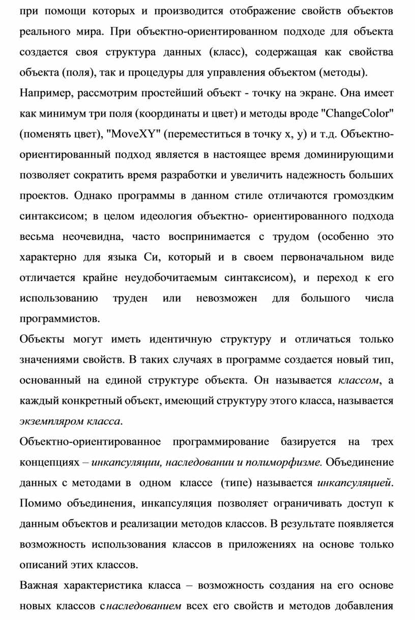 Например, рассмотрим простейший объект - точку на экране. Она имеет как минимум три поля (координаты и цвет) и методы вроде "ChangeColor" (поменять цвет), "MoveXY" (переместиться в точку х, у) и т.д. Объектно-ориентированный подход является в настоящее время доминирующим и позволяет сократить время разработки и увеличить надежность больших проектов. Однако программы в данном стиле отличаются громоздким синтаксисом; в целом идеология объектно- ориентированного подхода весьма неочевидна, часто воспринимается с трудом (особенно это характерно для языка Си, который и в своем первоначальном виде отличается крайне неудобочитаемым синтаксисом), и переход к его использованию труден или невозможен для большого числа программистов.